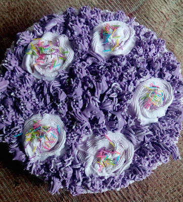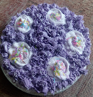 Transfer the cooled cake to a turn table, cut it in half from the centre. Moist the cake with sprinkling some water on it. Now generously spread the black currant crush over it and then spread the blueberry icing over it and cover the cake with top piece. Repeat the process of moisturising it with water, then spreading black currant crush and finally covering it entirely with the blueberry icing. Now using the blueberry cream-piping bag, create big flowers over the cake. Now using the purple coloured icing, create a grass like effect all over the remaining part of the cake. Use some coloured sprinklers on the flowers and you have yourself an amazing looking and awesome tasting blueberry cake with a twist of blackcurrant…!!